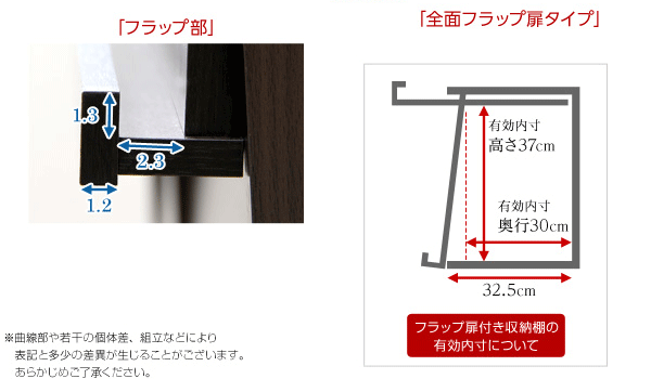 棚の奥行きは、オープン棚が32cm、フラップ扉付きの棚の有効内寸が30cmです。